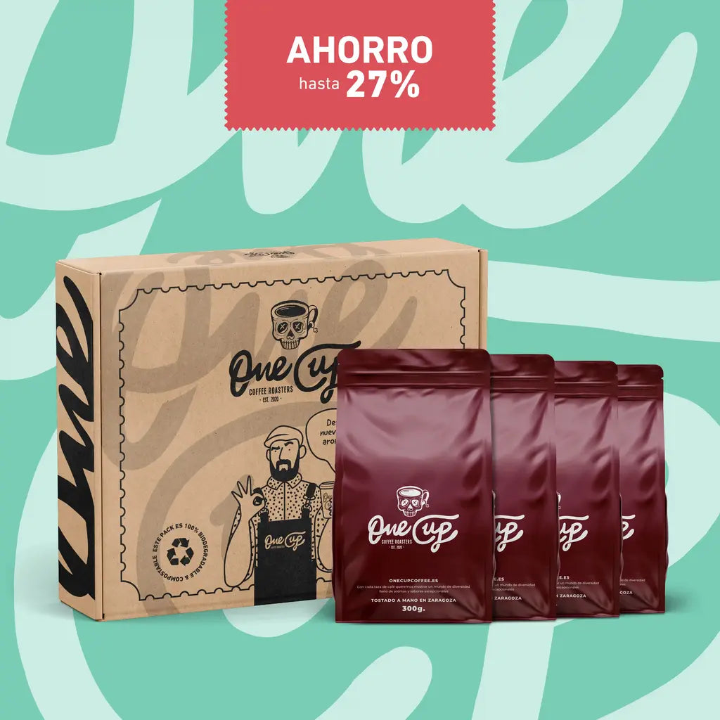 El pack incluye 4 paquetes de 300g de una selección de nuestros cafés de especialidad. ¡Déjate sorprender por nuestro maestro tostador!