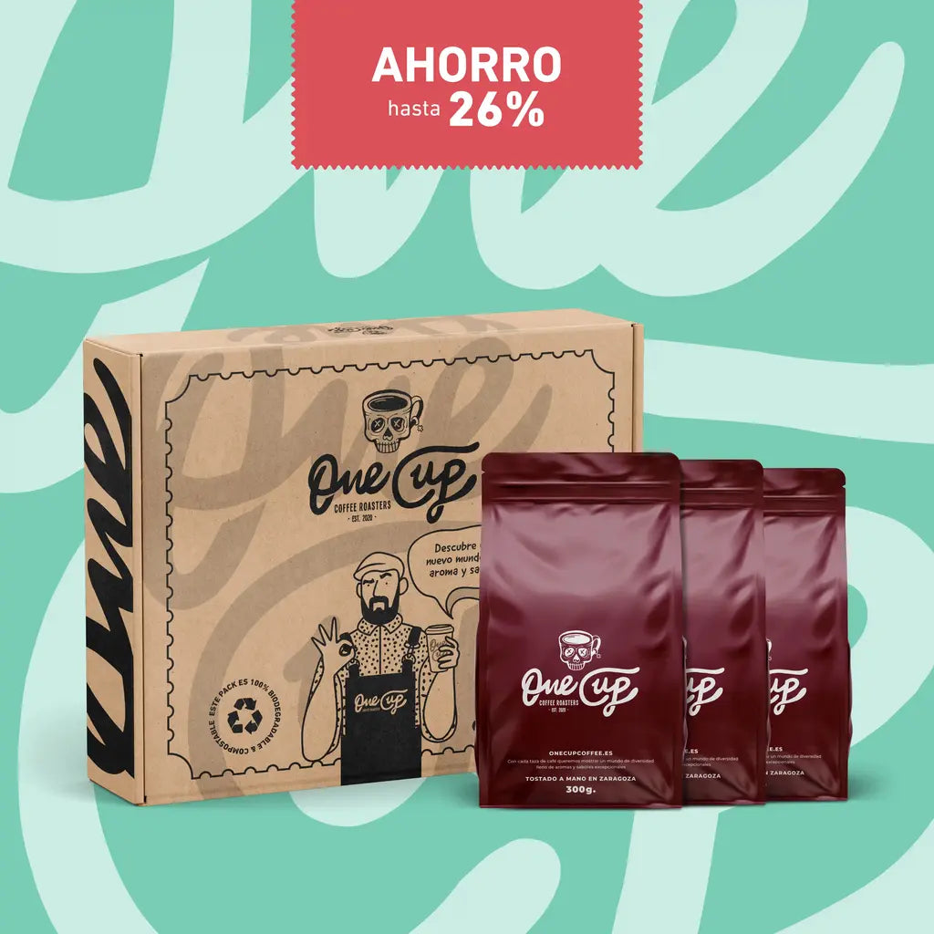 El pack incluye 3 paquetes de 300g de una selección de nuestros cafés de especialidad. ¡Déjate sorprender por nuestro maestro tostador!